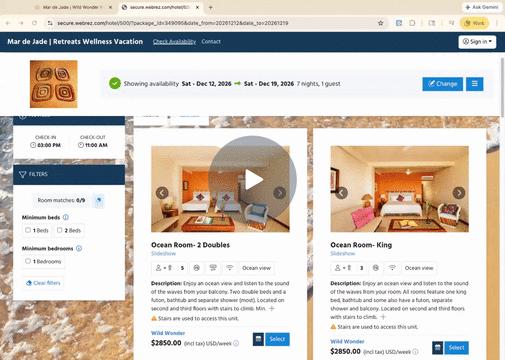 Choose your accommodation and complete payment directly with the resort. Prices for accommodations vary by room selection + whether you want a private room or a share.